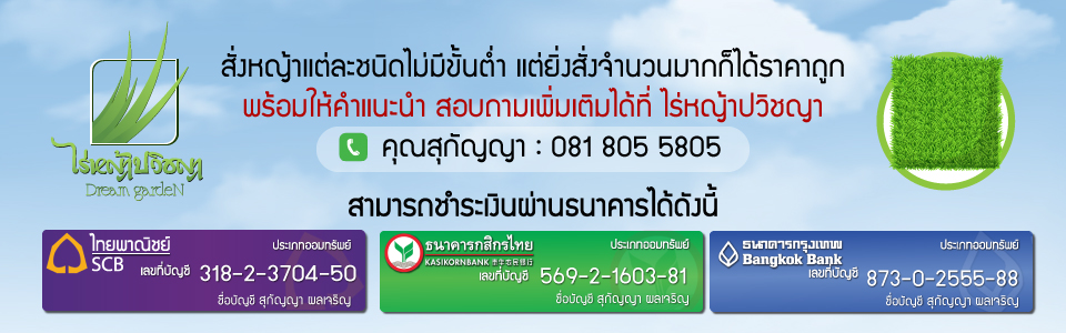 จำหน่ายหญ้าปูสนามราคาเริ่มต้นตารางเมตรละ 10 บาท ราคาส่งตรงจากไร่ ไม่ผ่านคนกลาง จัดส่งและจำหน่ายทั่วประเทศ (ค่ารถคิดตามระยะทาง กรุณาโทรสอบถาม 081 805 5805 ) หญ้าสด หญ้าจริง มีคุณภาพ ราคาถูก บนพื้นที่มากกว่า 100 ไร่ จึงมีหญ้าสดตลอดทั้งปี รับปูสนามหญ้าจริง หญ้าพาสพาลั่ม หญ้าเบอร์มิวด้า หญ้ามาเลเซีย หญ้าญี่ปุ่น หญ้านวลน้อย รับปูสนามหญ้า รับปูสนามฟุตบอล รับปูหญ้าสนามกอล์ฟ รับปูหญ้าสนามรอบบ้าน รับปูหญ้าสนามโรงเรียน รับปูหญ้าสนามรอบโรงแรม รับปูหญ้าสนามรอบบ้านพัก รับปูหญ้ารอบสนามรีสอร์ท รับปรับพื้นที่ทุกชนิด จำหน่าย พันธุ์ไม้ดอก ไม้ประดับ ไม้มงคล นานาชนิด ไม้ถุง ดิน ปุ๋ย บริการออกแบบและจัดแต่งสวน สวนหิน ทุกชนิด